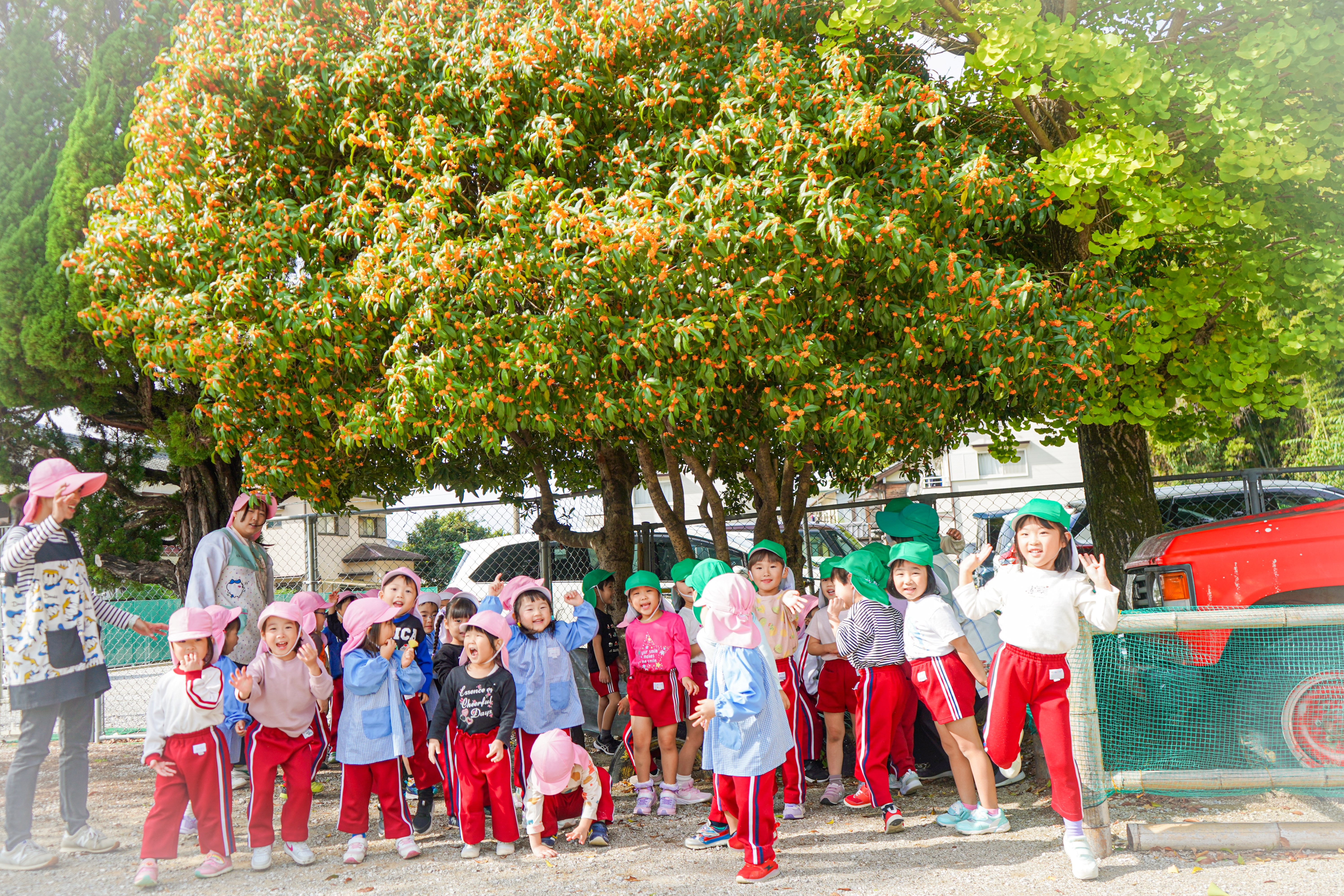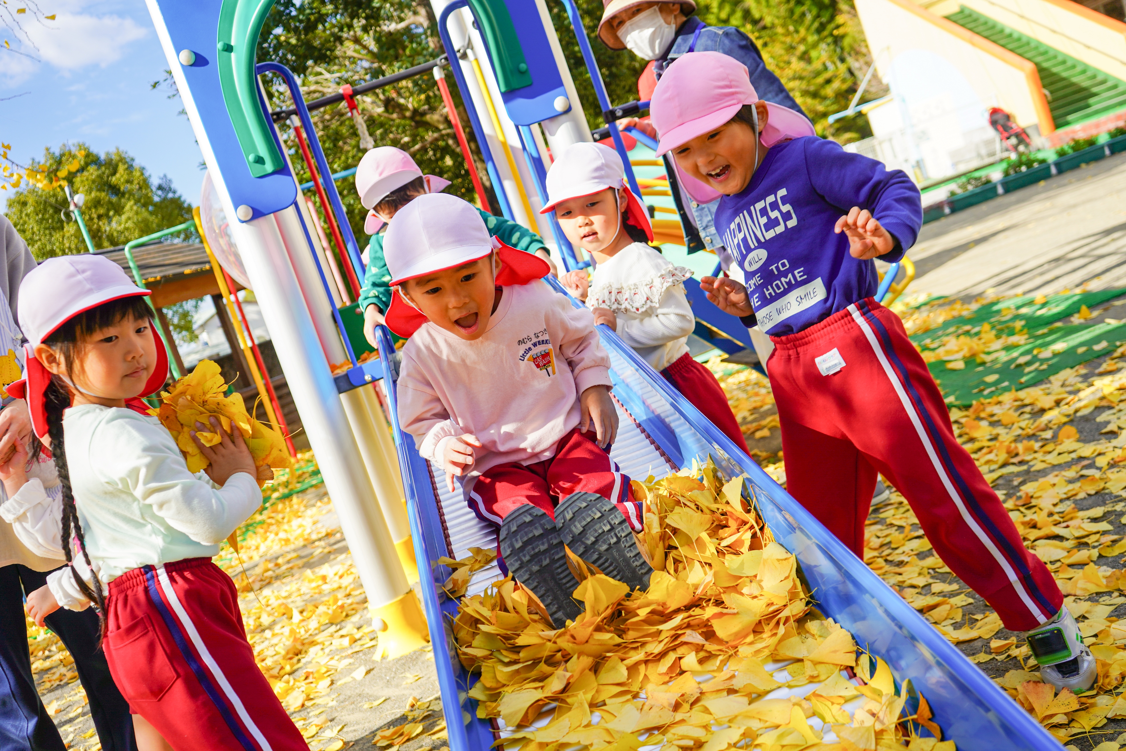 01Dec秋がやってきました。日々の様子12月に入りました。11月はまだまだ暑い日も多く、いつ秋が来るのか待ち遠しかったですが、いよいよ涼しくなってきて、少しばかり過ごしやすくなりました! きんもくせいも、この時期は園庭にとてもいい香りがひろがります☆彡 「イチョウのすべり台だよ~」子どもたちも落ち葉などで色んな遊びを考えていました! イチョウのシャワー☆彡みんなとても楽しそうです!